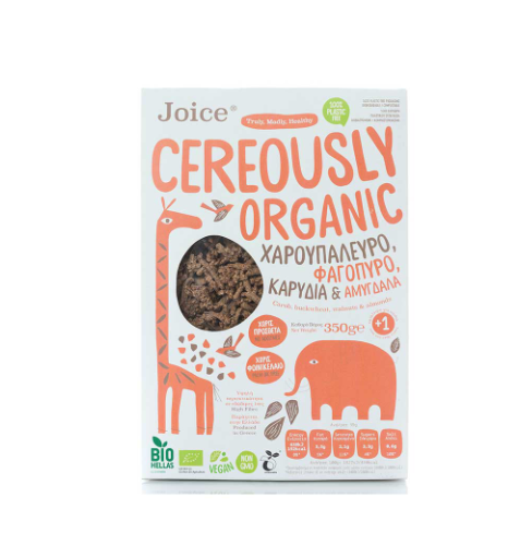 Η απόλυτα καινοτόμα διαδικασία παραγωγής προσφέρει μέσα σε μια bio κουταλιά όλα τα πλούσια συστατικά που συμπεριλαμβάνονται στα βιολογικά δημητριακά Joice. Τα βιολογικά δημητριακά με Χαρουπάλευρο προσφέρουν όλες τις ευεργετικές ιδιότητες των συστατικών και μια πλούσια γευστική εμπειρία σε μικρούς και μεγάλους συνδυάζοντας την υγιεινή διατροφή με την απόλαυση.