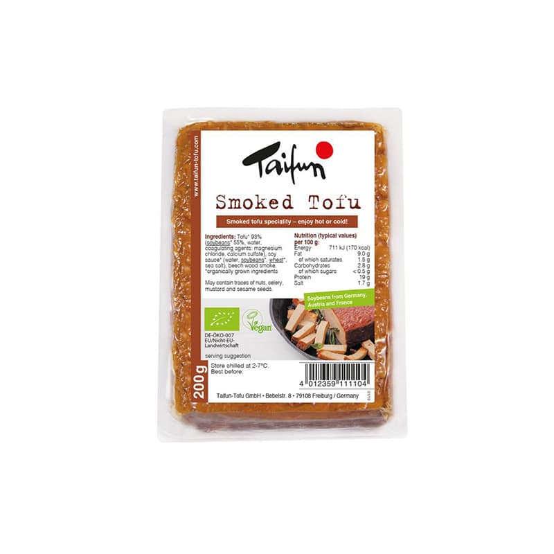 τόφου* 93% (φασόλια σόγιας* 55%, νερό πηκτικό μέσο: χλωριούχο μαγνήσιο, θειικό ασβέστιο), σάλτσα σόγιας* (νερό, φασόλια σόγιας*, σιτάρι*, θαλασσινό αλάτι), καπνισμένο σε ξύλο οξιάς. *προϊόν βιολογικής γεωργίας. Μπορεί να περιέχει ίχνη ξηρών καρπών, σέλινου, σιναπιού και σουσαμιού.