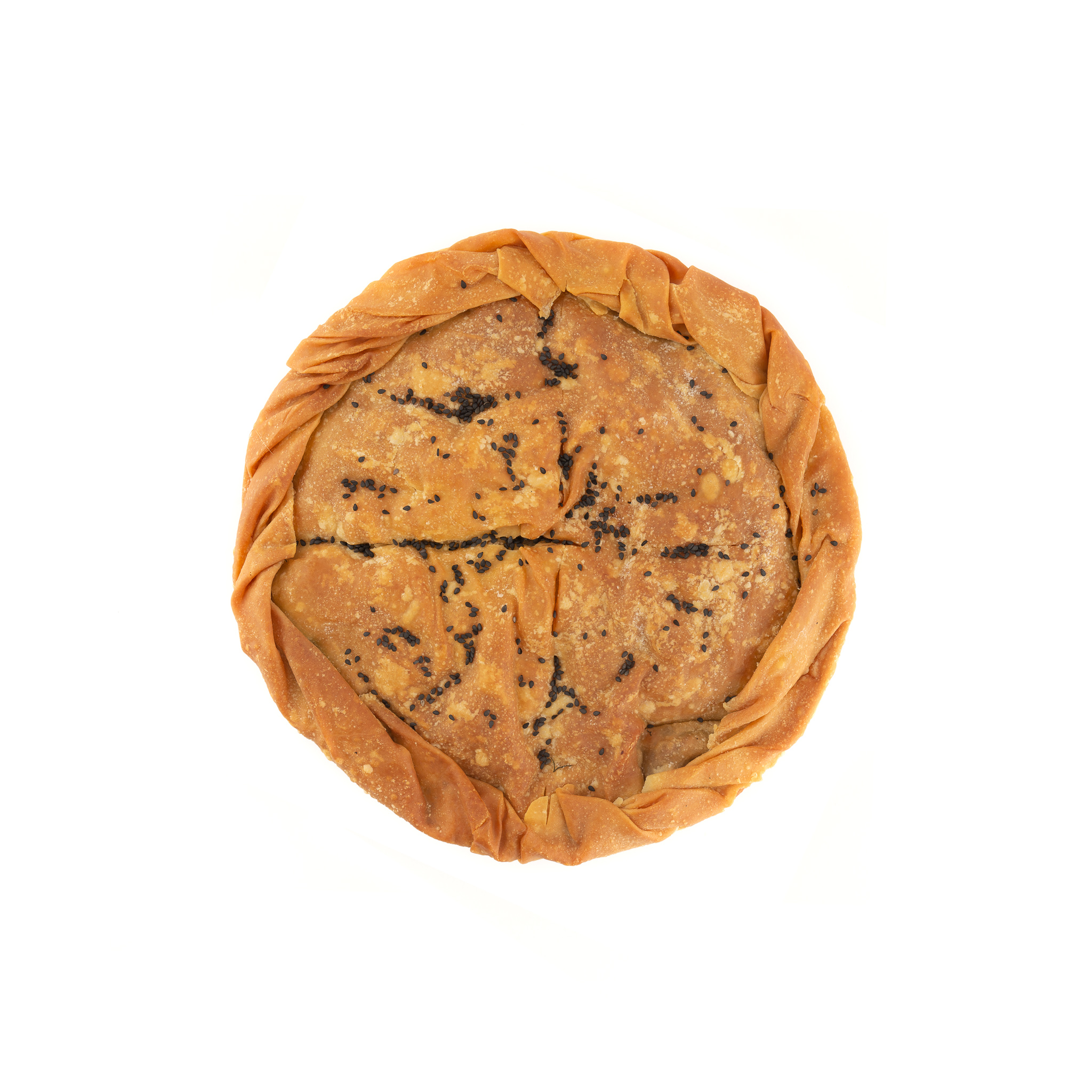 Τυρόπιτα με φέτα Π.Ο.Π, μυζήθρα, εξαιρετικό παρθένο ελαιόλαδο και μαυροσούσαμο, με χειροποίητο χωριάτικο φύλλο. Πιστοποιημένο από το Οργανισμό «ΔΗΩ».