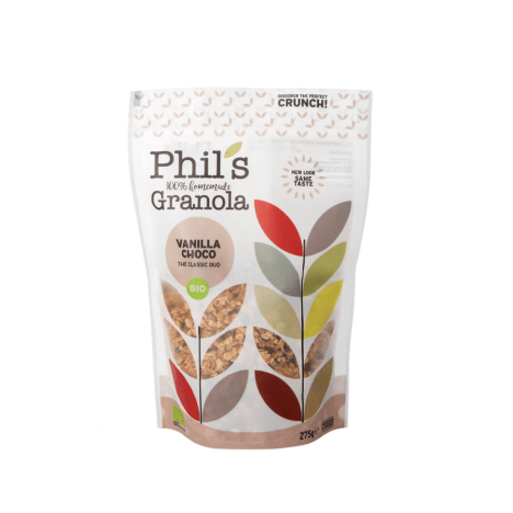 Στη Phil’s Granola Παράγουμε vegan, πιστοποιημένη βιολογική γκρανόλα με φυσικά γλυκαντικά. Η γκρανόλα μας Vanilla Choco είναι ο τέλειος συνδυασμός βανίλιας και σοκολάτας που σίγουρα θα σας ενθουσιάσει. Φτιαγμένη με νιφάδες βρώμης, βανίλια Μαδαγασκάρης, Vegan Σταγόνες Σοκολάτας (κακαόμαζα, ζάχαρη καρύδας), σιρόπι σφενδάμου και έξτρα παρθένο λάδι καρύδας, είναι ένα υγιεινό και γευστικό σνακ που μπορείτε να απολαύσετε ανά πάσα στιγμή.